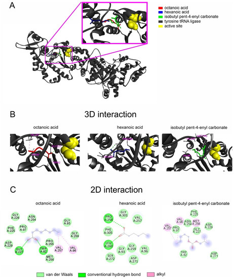 (A) Protein structure of Stagonosporopsis cucurbitacearum tyrosine-tRNA (gray) and the active site (yellow) interacting with octanoic acid (red), hexanoic acid (blue), and isobutyl pent-4-enyl carbonate (green). (B) 3D interaction and (C) 2D interaction map representation of Stagonosporopsis cucurbitacearum tyrosine-tRNA with octanoic and hexanoic acids and isobutyl pent-4-enyl carbonate. All amino acids belonging to the lipid environment binding site are represented.