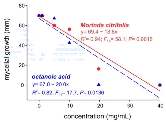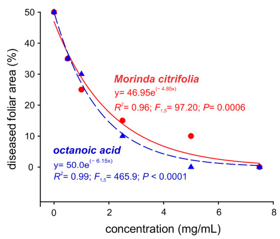 The results of the mycelial growth inhibition, phytotoxicity, photosynthesis, stomatal conductance, and curative actions of noni EO and octanoic acid were subjected to regression analysis using the curve-fitting procedures available in SigmaPlot 12.5 software (Systat Software Inc., San Jose, CA, USA). The regression model was chosen based on parsimony, and the assumptions of normality and homogeneity of variance were also checked.
