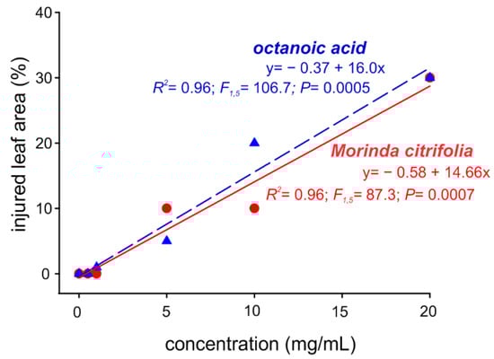 Leaf area damage (phytotoxicity) in Cucumis melo plants as a function of different concentrations of the octanoic acid and Morinda citrifolia essential oil.