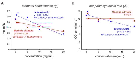 We further evaluated whether noni EO and octanoic acid would interfere with the melon plant physiology (e.g., stomatal conductance and gas exchange rates). Stomatal conductance (gl; mol m−2 s−1) and CO2 net assimilation (A; μmol m−2 s−1), which is a photosynthesis indicator, were measured under environmental CO2 conditions using a portable infrared gas analyzer (model LI-6400 XT, Li-color, Inc. Lincoln, Dearborn, MI, USA). The leaf chamber was adjusted to work under artificial light saturation of 1200 mmol m−2 s−1, the internal temperature of the chamber was adjusted to 30 °C, and the CO2 concentration was standardized to that in the environment.