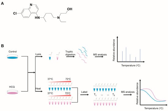 Workflow of the quantitative proteomics and the thermal proteome profiling studies. (A) The chemical structure of HCQ. (B) Overall workflows of the quantitative proteomics and the thermal proteome profiling. MIA PaCa-2 cells were treated with or without HCQ, respectively. For the quantitative proteomics study, cell lysates were digested with trypsin and analyzed by LC-MS/MS; for the thermal proteome profiling, cells were equally divided into eight aliquots, heated from 37 °C to 72 °C, and the samples were analyzed by LC-MS/MS after TMT labeling.