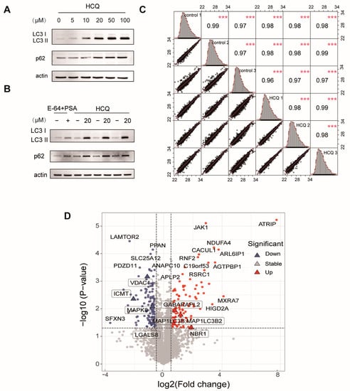 The influence of HCQ on the proteome. (A) HCQ inhibited autophagy dose-dependently. (B) Autophagy was well blocked in each replicate for the quantitative proteomics study. (C) The correlation between the three replicates (***, p < 0.001). (D) The volcano map showed the protein dynamics in response to HCQ treatment. Gray: unchanged proteins; red: upregulated proteins; blue: downregulated proteins.