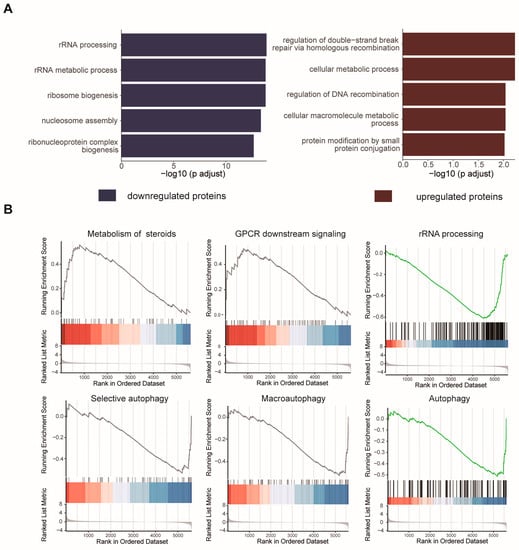 To elucidate the cellular processes affected by HCQ, we performed an enrichment analysis of the dynamic proteins induced by HCQ using Gene Ontology (GO) databases (Figure 4A) (Table S2). In the biological process category, upregulated proteins were mainly enriched in the regulation of double-strand break repair via homologous recombination (adjusted p = 5.9 × 10−3), cellular metabolic process (adjusted p = 5.9 × 10−3) and regulation of DNA recombination (adjusted p = 9.1 × 10−3), while downregulated proteins were enriched in rRNA processing (adjusted p = 1.28 × 10−14), rRNA metabolic process (adjusted p = 1.56 × 10−14), and ribosome biogenesis (adjusted p = 1.56 × 10−14) (Figure 4A). These results suggested that HCQ is highly involved in cellular metabolic processes, which is not surprising because mounting evidence has demonstrated that autophagy is closely related to metabolic diseases, such as insulin resistance, sarcopenic obesity, and type 2 diabetes mellitus. These diseases are resulting from the accumulation of lipid droplets, protein aggregates, and damaged organelles with impaired autophagy [27]. In addition, it has been reported that autophagy is highly related to RNA processes. For example, a long noncoding RNA (lncRNA) CA7-4 can regulate autophagy and apoptosis of high glucose-induced vascular endothelial cells by competing with MIR877-3P and MIR5680 [28].