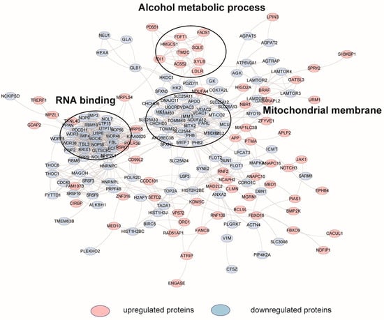 To further reveal the mechanism of HCQ to inhibit autophagy and the network in which the differentially expressed proteins are involved, we performed the protein-protein interactions (PPIs) analysis based on the STRING database (v11, European Molecular Biology Laboratory (EMBL), Rome, Italy, http://www.string-db.org/, accessed on 19 January 2019) and the functional enrichment of key networks of PPIs with the StringAPP (v1.7.0, National Institute of General Medical Sciences (NIGMS), Maryland, MD, USA, https://apps.cytoscape.org, accessed on 4 July 2022) embedded in Cytoscape (v.3.8.2, National Institute of General Medical Sciences (NIGMS), Maryland, MD, USA, https://cytoscape.org/, accessed on 4 July 2022) [30]. As shown in the interaction network, the upregulated proteins were related to alcohol metabolic process while the downregulated proteins were clustered in RNA binding and mitochondrial membrane (Figure 5).