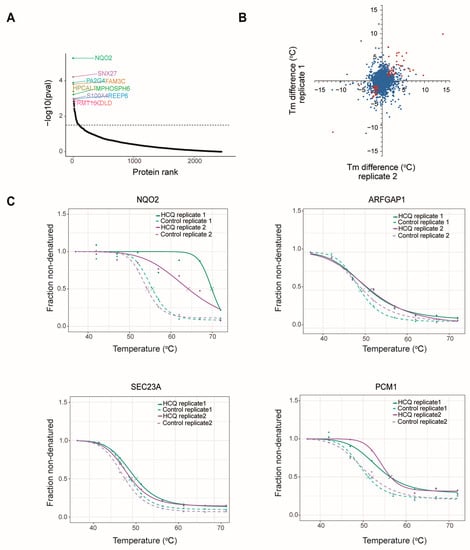 The potential binding proteins of HCQ. (A) Ranked proteins according to the p-value. A total of 2567 proteins contained sufficient data points for the analyses and 75 of them had p-values lower than 0.05. (B) Distribution of the proteins according to △Tm in two replicates; blue: total proteins in two replicates; red: proteins with p-values lower than 0.05 and |△Tm| higher than 1. (C) Thermal melt curves of the representative proteins NQO2, SEC23A, PCM1, and ARFGAP1.