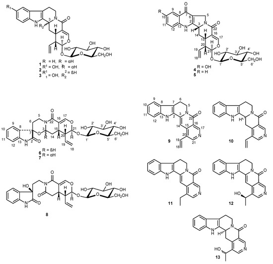 Based on previous reports, e.g., [37], the hetero-aromatized pyridine moiety present in compounds 9–13 could be formed in later steps of the biosynthesis by reacting with ammonium ions to introduce an amino group. According to the reported indolopyridine alkaloid synthesis based on biological strategies, this type of alkaloid could be formed via an intermediate derived from deglucosylation of strictosamide (1) [32,37,38].
