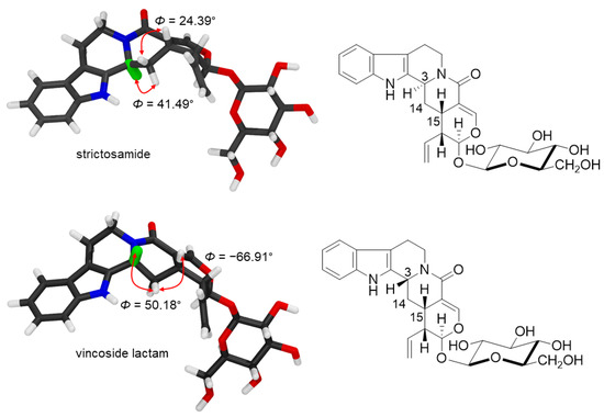Strictosamide (1, αH), and its enantiomer vincoside lactam (βH) differ in stereochemistry at C-3 position as shown in the 3D structures displayed in Figure 3. In order to get insights in the molecular stability of strictosamide (1) and vincoside lactam, we performed DFT calculations using Gaussian 09 software (Rev. B.01; Gaussian, Inc.: Wallingford, CT, USA) [20]. The lower total optimization energy of vincoside lactam (−1720.5249 a.u, −4.516377 × 106 kJ mol−1) suggests its higher stability than strictosamide (−1720.5149 a.u, −4.516351 × 106 kJ mol−1). The larger angle between protons H-3 and H-14 (Φ = 50.18°) as well as H-14 and H-15 (Φ = −66.91°) of vincoside lactam possess less strain energy between these protons (more staggered conformation). By contrast, the spatial proximity of H-3 and H-14 (Φ = −41.49°) as well as H-14 and H-15 (Φ = −24.39°) of strictosamide (1) affects the stability of its structure due to the more eclipsed conformation.