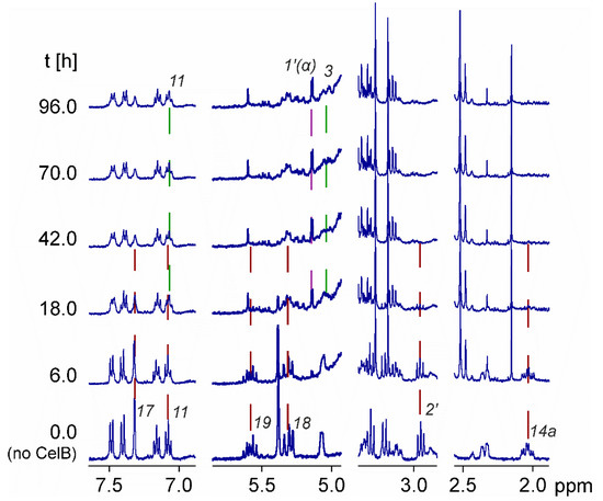 In situ 1H NMR spectra of the enzymatic deglucosylation of strictosamide (1) by β-glucosidase (CelB) in (10% DMSO-d6/D2O (pD 6.4) 1:9) [24,25,26]. Shown are the spectrum of 1 without CelB at 0.0 h and five spectra measured during the course of the reaction. Signals of H-11, H-14a, H-17, H-18, and H-2’ of strictosamide (1) are numbered in the spectrum recorded at 0.0 h and indicated with a red dashed line to indicate degradation by hydrolysis. Concomitant new signals of accumulated products arose. Some of those are numbered in the spectrum recorded after 96.0 h and indicated with green and pink dashed lines, respectively. The signal indicated violet belongs to the anomeric signal of the α-anomer of the released glucose. The signals indicated in green belong to protons of compound 1a. In particular, the signal of H-11 is well detectable. However, signals of some other protons appear much smaller than they should be, for example the signal from H-3. This is due to wash in of deuterium into this product, caused by equilibria between various tautomeric forms as earlier described for other compounds possessing keto functionalities.