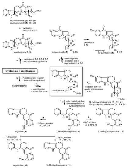 In Figure 5, we summarize some possible biosynthetic pathways that can lead to an accumulation of the alkaloids isolated in the present work. Here we start from tryptamine and secologanin, which in the first step react in a Pictet Spengler reaction to strictosidine or to paratunamide C (8), respectively. It should be noted that no strictosidine could be detected in the screening of alkaloids by LC-MS as described in Section 2.3. However, since this compound is regarded as the key intermediate in the biosynthesis of strictosamide (1), we assume that strictosidine was converted quantitatively to strictosamide (1) and not accumulated in the examined N. orientalis individual. Strictosamide (1), on the other hand, represents the key intermediate for most of the accumulated and isolated alkaloids by accomplishing different biosynthetic pathways. It thus appears that in N. orientalis compound 1 is accumulated as the last intermediate in a joint biosynthetic pathway towards several alkaloids.