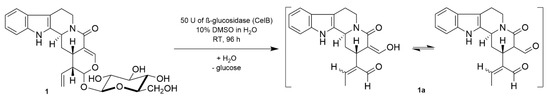 The disappearance of several indicative proton signals during biocatalyzed reaction progress revealed the hydrolysis of the glucoside moiety. Well visible are the decreasing 1H NMR signals of the terminal vinyl group at δH 5.56 ppm (H-19), δH 5.32 ppm (H-18a), and δH 5.29 ppm (H-18b). These chemical shifts differ slightly from those in Table S1, due to different solvent systems used in structure determination and in situ monitoring, respectively. Moreover, the appearance of several 1H NMR signals indicated the formation and accumulation of free glucose as well as of an aglycone, which is here indicated as compound 1a.
