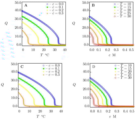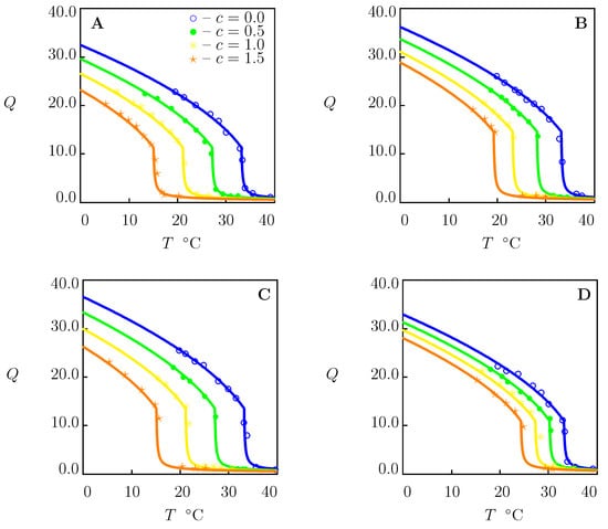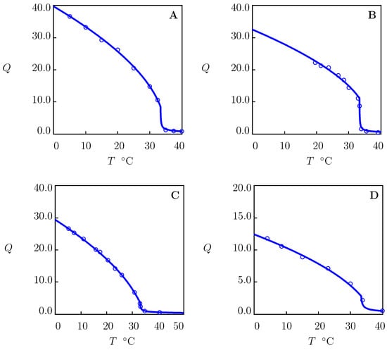 Equilibrium degree of swelling Q versus temperature T. Circles: experimental data on PNIPAAm gels in water. (A)—[38], (B)—[39], (C)–[40], (D)—[41]. Solid lines: results of numerical analysis.