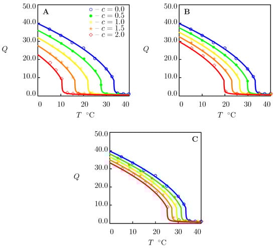 Equilibrium degree of swelling Q versus temperature T. Circles: experimental data on PNIPAAm gel [38] in aqueous solutions of salts with various concentrations c M. (A)—NaCl, (B)—NaBr, (C)—NaI. Solid lines: results of numerical analysis.