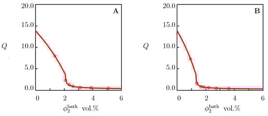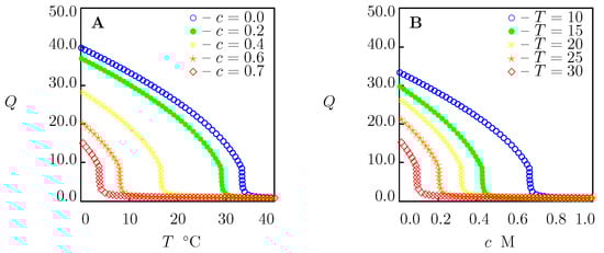 where summation was performed over all experimental points, and stands for the degree of swelling measured in a test. The quantity was found from Equation (21) which was solved numerically by the Newton–Raphson algorithm. The coefficient was calculated from Equation (32). To ensure an adequate description of the equilibrium swelling curves in the close vicinity of the critical temperature , numerical integration of Equation (34) was conducted with a small temperature step K.