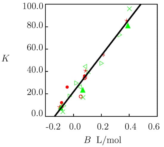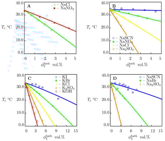 with two parameters, A and B. The coefficient A can be predicted theoretically [13]. The coefficients B for water–salt systems were reported in [13,14,15]. The effect of anions (for a fixed cation) on of a TR polymer is described by the equation [11]