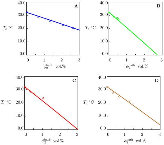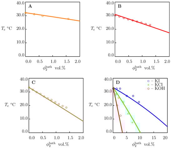 We analyzed experimental data in equilibrium swelling tests on poly(N-isopropylacrylamide) (PNIPAAm) gels and in light absorbance tests on un-cross-linked PNIPAAm chains in water [38,39,40,41] and aqueous solutions of NaCl, NaBr, NaI [38], NaCl, LiNO, NaNO, NaI [39], NaCl, NaSO, NaSCN [41], NaCl, NaOH [42], NaCl, NaNO [43], NaSCN, NaNO, NaCl, NaSO [44], KI, KBr, KCl, KSO, KOH [11], NaSCN, NaBr, NaSO [45]. NaBr [46], NaF [7], NaCO [47], KI, KCl, KOH [48], NaCl, NaHPO, NaSO, and NaPO [49] at temperatures T below and above the critical temperature . Detailed descriptions of the chemical compositions of the gels, their preparation and experimental conditions are provided in the original studies.
