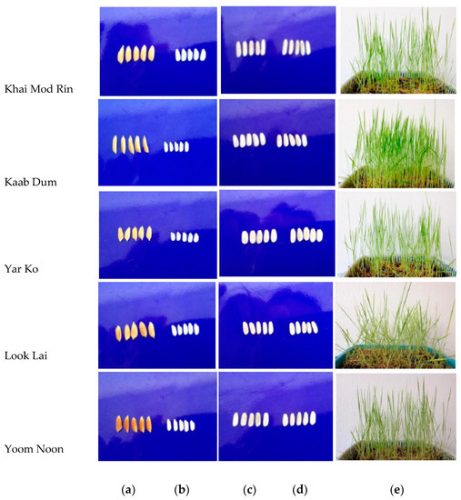 Appearances of paddy (a), white rice (b), brown rice (c), germinated brown rice (d), and rice grass (e) of southern Thai indigenous non-colored rice varieties, including Khai Mod Rin, Kaab Dum, Yar Ko, Look Lai, and Yoom Noon.