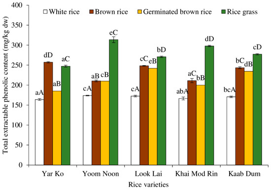 Effect of rice variety and processing condition on total extractable phenolic content of Thai indigenous rice. Bars represent the standard deviations from triplicate determinations. Different lowercase letters within the same processing condition indicate significant differences (p ˂ 0.05). Different uppercase letters within the same variety indicate significant differences (p ˂ 0.05).
