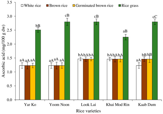 Effect of rice variety and processing condition on ascorbic acid content of Thai indigenous rice. Bars represent the standard deviations from triplicate determinations. Different lowercase letters within the same processing condition indicate significant differences (p ˂ 0.05). Different uppercase letters within the same variety indicate significant differences (p ˂ 0.05).
