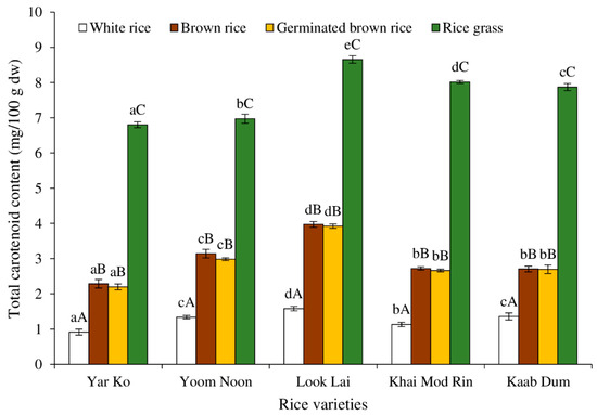 Notably, all five rice tests showed that the carotenoids in brown rice and germinated brown rice were identical. Because carotenoids are not generally water soluble, very little carotenoid was lost throughout the soaking and washing steps of making germinated brown rice. The carotenoid levels of the five rice samples connected to grain processing varied depending on the rice varieties’ input. The white rice with the largest amount of carotenoids was Look Lai, followed by Kaab Dum/Yoom Noon, Khai Mod Rin, and Yar Ko.