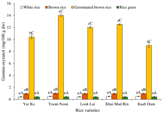 Effect of rice variety and processing condition on γ-oryzanol content of Thai indigenous rice. Bars represent the standard deviations from triplicate determinations. Different lowercase letters within the same processing condition indicate significant differences (p ˂ 0.05). Different uppercase letters within the same variety indicate significant differences (p ˂ 0.05).