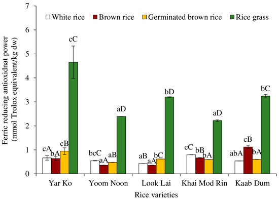 Effect of rice variety and processing condition on ferric reducing antioxidant power (FRAP) of aqueous extract of Thai indigenous rice. Bars represent the standard deviations from triplicate determinations. Different lowercase letters within the same processing condition indicate significant differences (p ˂ 0.05). Different uppercase letters within the same variety indicate significant differences (p ˂ 0.05).
