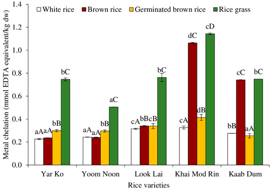 Effect of rice variety and processing condition on metal chelation of aqueous extract of Thai indigenous rice. Bars represent the standard deviations from triplicate determinations. Different lowercase letters within the same processing condition indicate significant differences (p ˂ 0.05). Different uppercase letters within the same variety indicate significant differences (p ˂ 0.05).