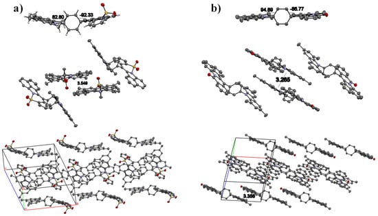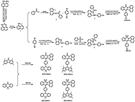 All reagents and solvents were purchased from commercial sources and used without further purification. The synthetic routes of the four compounds are outlined in Scheme 1. The detailed synthesis information is summarized in the Supporting Information. The compounds BSQ-Br and BBI-Br were synthesized by copper-catalyzed cyclization reactions, according to previously reported works [24,25,26,27,28]. Then, the target materials were successfully acquired through the reaction of transition metal-catalyzed N-C bond formation between the intermediate compounds [29]. Afterward, the products were purified by silica column chromatography and temperature-gradient sublimation with 1H/13C NMR, MALDI-TOF mass spectrometry (Figure S1–S9, Supporting Information) and single crystal X-ray diffraction (XRD).
