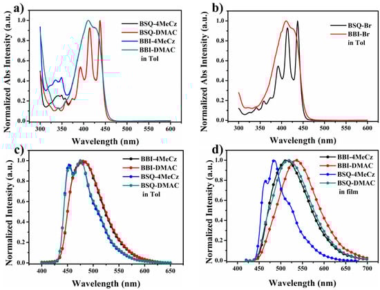 For the PL spectra (Figure 3c,d), the emission peaks of the BSQ-4MeCz and BSQ-DMAC were located at 474 nm (toluene solution), blue-shifted by approximately 8 nm compared to that of the BBI-4MeCz and BBI-DMAC (482 and 481 nm), which were derived from a more twisted structure. The unchanged PL peaks for the introduction of electron-donating elements indicated the main control of the polycyclic fused amide frames. In the film, the emission peaks of the BBI-4MeCz, BBI-DMAC, BSQ-4MeCz and BSQ-DMAC were located at 512, 533, 482 and 517 nm. The shorter emission wavelength of the BBI-4MeCz and BSQ-4MeCz can be ascribed to the weak electron-donating ability of tetramethylcarbazole. Meanwhile, the small redshift seen with the BBI-4MeCz (30 nm) and BSQ-4MeCz (10 nm) in the solid state compared to that in toluene solution was also attributed to the steric hindrance of the tetramethylcarbazole.