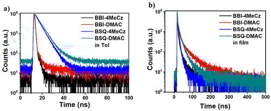 In addition, the PL properties of the four target materials and the acceptor moieties were also tested in different-polarity solvents; the related PL spectra are shown in Figure S15. Apparently, from low-polarity hexane to high-polarity acetonitrile, no obvious redshift was observed for the BBI-4MeCz and BSQ-4MeCz, indicating the LE characteristic in the excited state. However, an intense long-wavelength emission peak appeared in high-polarity solvents for the BBI-DMAC and BSQ-DMAC, suggesting CT features in the excited state. Besides this, the PLQYs in the solution conditions were detected to be 9.1%, 7.6%, 77.3% and 78.1% for the BBI-4MeCz, BBI-DMAC, BSQ-4MeCz and BSQ-DMAC, respectively, indicating that a higher EL performance is expected with the BSQ-4MeCz and BSQ-DMAC. The lower PLQYs for the BBI-4MeCz and BBI-DMAC were ascribed to the structural relaxation of the BBI unit. Transient PL decay spectra exhibited single exponential decay with a nanosecond lifetime in both toluene solution and thin film (Figure 4 and Table 1), suggesting the conventional fluorescence properties of these four emitters. The corresponding radiative rates (ΚF) were calculated, in which the BSQ-4MeCz possessed the highest KF of 1.7 × 108 s−1. Furthermore, the fluorescence and phosphorescence spectra at 77 K of these four emitters were also tested. In general, the low temperature fluorescence spectra exhibited hypochromatic shifts compared with those at room temperature, which can be attributed to suppressed molecular relaxation [32]. As shown in Figure S16, the PL spectra exhibited fine vibrational and structural bands, indicating the LE feature of all the emitters, which is perhaps due to the emissions coming from the donor or acceptor fragments.
