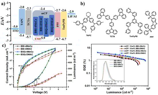 Figure 5. (a) Device architecture and energy level diagram; (b) Chemical structures of the related materials applied in devices; (c) J-V-L and EQE-L characteristics of the fabricated devices.