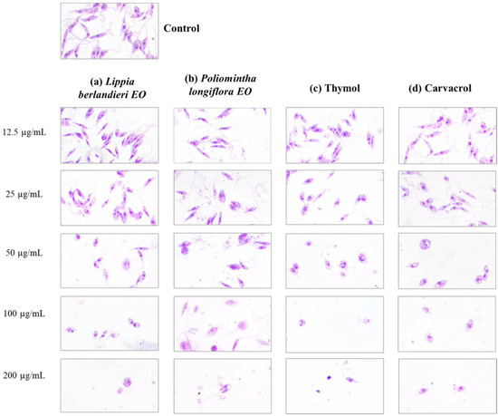 Figure 2. Effect of (a) Lippia berlandieri EO, (b) Poliomintha longiflora EO, (c) thymol, and (d) carvacrol on morphological changes in Leishmania mexicana promastigotes. Parasites were treated with 0, 12.5, 25, 50, 100, and 200 μg/mL of EOs or pure compounds, incubated for 24h, stained with Giemsa, and analyzed by light microscopy at 100X.