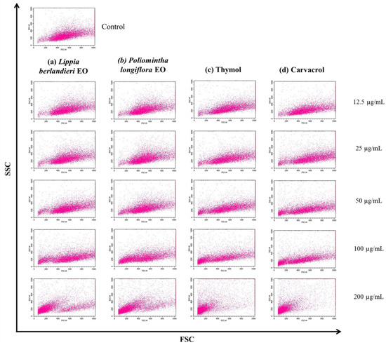 Figure 3. Effect of (a) Lippia berlandieri EO, (b) Poliomintha longiflora EO, (c) thymol, and (d) carvacrol on size (FSC) and granularity (SSC) of Leishmania (L.) mexicana promastigotes. Parasites were treated with 0, 12.5, 25, 50, 100, and 200 μg/mL of EOs or pure compounds, incubated for 24 h, and analyzed by flow cytometry. Images are representative of three independent experiments.