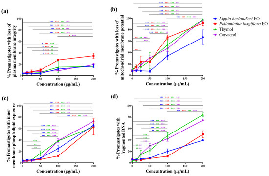 Figure 4. Characterization of the effect induced on Leishmania mexicana promastigotes by Lippia berlandieri EO, Poliomintha longiflora EO, thymol, and carvacrol. Parasites were treated with 0, 12.5, 25, 50, 100, and 200 μg/mL of EOs, thymol, or carvacrol; incubated for 24 h; and stained and analyzed by flow cytometry. (a) Loss of plasma membrane integrity, (b) loss of mitochondrial membrane potential, (c) inner membrane phospholipids (PL) exposition, and (d) DNA fragmentation. Data represent the mean and SD of three experiments. Statistical comparison was performed with two-way ANOVA (concentration x effect) with Tukey’s multiple comparison test, * p ≤ 0.05, ** p ≤ 0.01, and *** p ≤ 0.001.