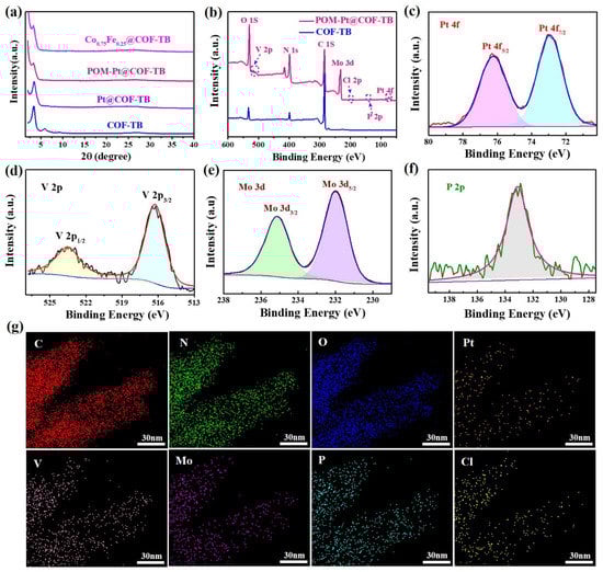(a) Powder X–ray diffraction (PXRD) patterns of prepared COFs; XPS spectra of POM–Pt@COF–TB: (b) full elements; (c) Pt; (d) v; (e) Mo, (f) P; (g) EDS mapping images of POM–Pt@COF–TB.