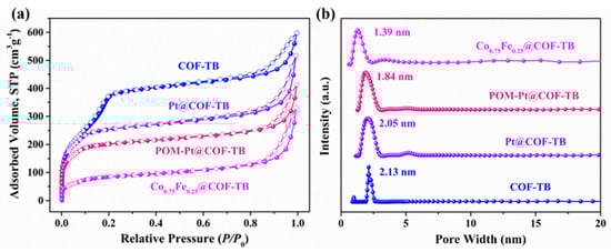 Furthermore, the porosity data of prepared composites could be obtained from N2 adsorption measurements at 77 K according to the supplementary materials. On the one hand, the specific surface areas of COF–TB were reduced from 1216 to 965 m2 g−1, and the pore size distribution calculated by NLDFT method also decreased to 2.05 nm after the modification of Pt (Figure 2 and Figures S1–S3, Table 1). After the introduction of POM, the specific surface area of POM–Pt@COF–TB remained at 738 m2 g−1. The pore size distribution of POM–Pt@COF–TB was concentrated, and the pore size decreased to 1.84 nm compared to the initial COFs (Figure 2, Table 1). On the other hand, the specific surface areas of COF–TB decreased from 1216 to 319 m2 g−1 (Figure 2a and Figure S4) with the entry of Fe and Co into the pore structure of COFs. The pore size of COF–TB was decreased from 2.13 to 1.39 nm (Figure 2b and Table 1). The reduction in specific surface area and pore size may have been caused by the introduction of metals or POM in the pore channel. The single pore size distribution of the obtained COF–based composites demonstrates the uniformity of the modification.