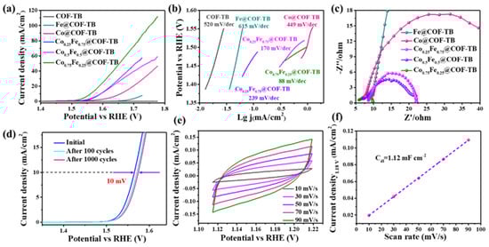 (a) LSV curves toward OER of COF–TB, CoxFe1–x@COF–TB (x = 0, 0.25, 0.5, 0.75, 1); (b) Tafel slopes of the prepared materials; (c) Nyquist plots of CoxFe1–x@COF–TB (x = 0, 0.25, 0.5, 0.75, 1); (d) LSV curves for Co0.75Fe0.25@COF–TB before and after 100 and 1000 cycles of CV scans; (e) CV plots of Co0.75Fe0.25@COF–TB tested at various scan rates from 10 to 90 mV s−1; (f) ECSA evaluation.