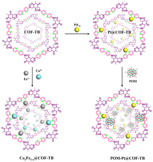 2,4,6–Trihydroxybenzene–1,3,5–tricarbaldehyde was ordered from Jilin Yanshen Technology Co., Ltd., Jilin, China. 2,2’–Bipyridine–5,5’–diamine, acetic acid (99%) was obtained from Bide Pharmatech Co., Ltd., Shanghai, China. 1,3,5-Trimethylbenzene (97%), 1,4–dioxane (97%), potassium tetrachloroplatinate(II) (K2PtCl4, 98%), deuterium oxide (99.9%), sodium metavanadate (99.0%), sodium phosphate dibasic dodecahydrate (99%), and sodium molybdate dihydrate (99.0%) were prepared from Aladdin Co., Ltd., Shanghai, China. A total of 30 wt % H2O2 aqueous water, dimethylformamide (DMF, ≥99.5%), isopropyl alcohol (≥99.7%), and methanol (≥99.5%) were bought from Xilong Scientific Co., Ltd., Shantou, China. Iron(III) chloride hexahydrate and cobalt(II) chloride were obtained from Shanghai Macklin Biochemical Co., Ltd., Shanghai, China. The preparation of COF–TB [37] and 11–molybdo–1–vanadophosphoric acid (polyoxometalates, POM) [49,50] was based on the supplementary materials. The preparation of COF–TB needs to be carried out at 120 °C without water and oxygen, while the preparation of POM needs to be carried out under normal conditions. The prepared products were dried under vacuum overnight without special instructions.