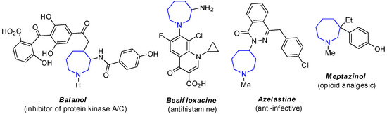 Azepane and its functionalized derivatives are important structural motifs present in variety of natural products and bioactive molecules with a wide range of medicinal and pharmaceutical properties [1,2,3,4,5,6,7,8] including antidiabetic [9,10,11], anticancer [12,13,14], and antiviral [15,16,17] activities, thus attracting a significant interest of the researchers in a new lead compound discovery. The most cited example of a natural product containing an azepane core is the fungal metabolite protein kinase inhibitor Balanol [18]. Additional examples of bioactive synthetic azepane-based compounds are depicted on Figure 1. Despite remarkable efforts being made to develop efficient synthetic methods for these seven-membered azacycles [19,20,21,22,23,24,25,26,27,28,29,30,31], slow cyclization kinetics have hindered the development of robust methods for the direct construction of these medium-ring heterocyclic systems [32]. Therefore, the development of new effective strategies for the selective preparation of azepane derivatives with unique substitution patterns is of great interest.