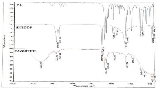 FT-IR spectrometric analysis was conducted to detect any incompatibilities in the CA-SNEDDS formulation [77]. It was measured with a Bruker Tensor 27 FT-IR spectrophotometer (Varian Company model: 640-IR, Mulgrave, Victoria, Australia). The FT-IR spectra were recorded, and the absorption peaks were observed at 400–4000 cm−1.