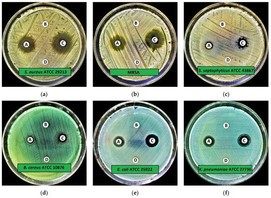 The preliminary antimicrobial activity of CA-SNEDDS and control samples was examined by the disc diffusion technique [78,79,80]. Modified Mueller–Hinton agar (MMHA) and potato dextrose agar (PDA) media were utilized to determine the antibacterial and antifungal activities, respectively. The MMHA and PDA were prepared by following the manufacturer’s instructions and a previous study [78]. Sterile discs with a 6 mm diameter were employed in this investigation. Each disc was impregnated with its respective sample with 20 µL/disc. Before inoculating impregnated discs on the surface of the test media, the impregnated discs were sterilized by ultra-violet (UV) light for 20 min.
