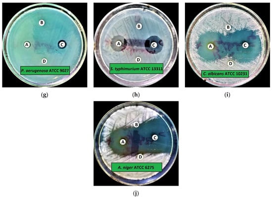 Preliminary antimicrobial activity of CA-SNEDDS: (a) S. aureus ATCC 29213; (b) MRSA; (c) S. saptophyticus ATCC 43867; (d) B. cereus ATCC 10876; (e) E. coli ATCC 25922; (f) K. pneumoniae ATCC 27736; (g) P. aeruginosa ATCC 9027; (h) S. typhimurium ATCC 13311; (i) C. albicans ATCC 10231; (j) A. niger ATCC 6275. Note: A = CA-SNEDDS; B = SNEDDS; C = Positive control; D = Negative control.