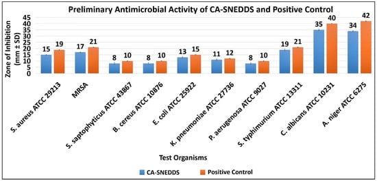 CA-SNEDDS displayed significant antimicrobial activity against the tested organisms, as shown by the overall antimicrobial results. This activity seems to be attributable to CA since the absence of CA in the SNEDDS formulation rendered it inactive against microorganisms. In addition, several researchers have reported that CA is a potent antimicrobial agent against Gram-positive and Gram-negative bacteria and fungi [42,43,44,45,46,47,48].