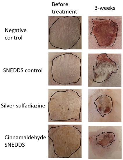 Morphological appearances of the negative, SNEDDS control, silver sulfadiazine, and cinnamaldehyde SNEDDS groups at the time of skin burn induction and the end of the experimental procedure. Image markings in black indicate the wound area for all the groups before and after treatment.