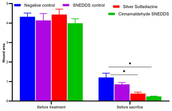 Wound size on day 0 of skin burn induction and after 3 weeks of treatment. Values are denoted as mean ± SEM, N = 5 rats per group. Statistical significance was found using two-way ANOVA, followed by a post hoc test in GraphPad Prism 8.0.2. * p < 0.05 using Tukey’s multi-group comparisons.