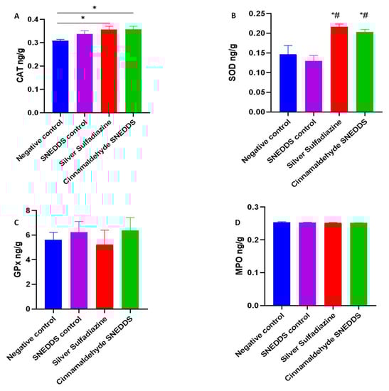 Effect of cinnamaldehyde on antioxidant and oxidant levels in the model of skin burn rats. Values are denoted as mean ± SEM, N = 5 rats per group. Statistical significance was found using one-way ANOVA, followed by a post hoc test in GraphPad Prism 8.0.2. (A) Catalase (CAT), (B) superoxide dismutase (SOD), (C) glutathione peroxidase (GPx), and (D) malonaldehyde peroxide (MPO). * p < 0.05 vs. negative control and # p < 0.01 vs. SNEDDS control using Tukey’s multi-group comparisons.