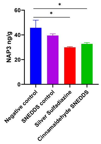 Effect of cinnamaldehyde on the inflammatory marker in skin burn rat model. Values are denoted as mean ± SEM, N = 5 rats per group. Statistical significance was found using one-way ANOVA, followed by a post hoc test in GraphPad Prism 8.0.2. NAP3: Neutrophil-activating protein 3. * p < 0.05 vs. negative control using Tukey’s multi-group comparisons.