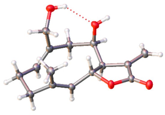 Structurally, compound 1 is an endo [4+2] Diels–Alder dimeric sesquiterpene lactone of 1,10-secoeudesmanolides moiety and a guaiane monomer, which has been firstly isolated from Inula japonica Thunb [17]. In addition, compound 6 was also isolated from this species for the first time. The X-ray crystallographic analysis (Figure 2) showed that there was hydrogen bonding between the C8-OH and C15-OH in 4 that has not been reported in a previous study [23]. We also optimized the flack parameter from −0.06 (7) to −0.04 (5), which allowed us to get a more specific explicit assignment of the absolute structure.
