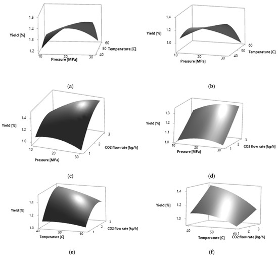 The calculated optimal conditions for obtaining the maximum extraction yield were, for both plant materials, 30 MPa, 40 °C and flow rate of 3 kg·h−1. The higher selectivity of the total extraction yield was obtained at lower temperatures and higher flow rates. On the selected surface plots, it can be observed that the total extraction yield increases with the increase in the CO2 flow rate (Figure 1). With the increase in pressure and CO2 flow rate, the total extraction yield increases in both plant materials analyzed. The total extraction yield is the highest at lower temperatures.