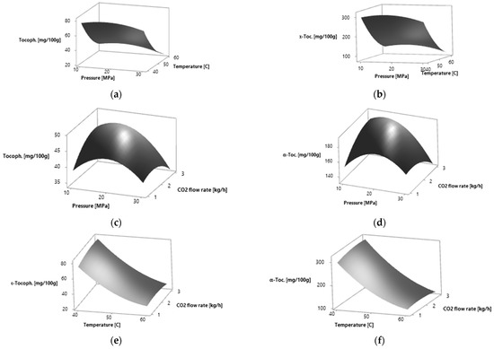 The effects of process parameters on the studied response variables, the α-tocopherol relative amount, were drawn in the form of response surface figures (Figure 2). The total α-tocopherol relative amount increases when increasing the pressure to 16.54 MPa for yellow leaves and to 15.85 MPa for amber leaves and then it decreases. The highest α-tocopherol relative amount was obtained at 40 °C. At the CO2 flow rate of 2.65 kg·h−1 for yellow leaves and 2.77 kg·h−1 for amber leaves, the highest α-tocopherol relative amount was obtained. A further increase in the CO2 flow rate led to the decrease in α-tocopherol relative amount.