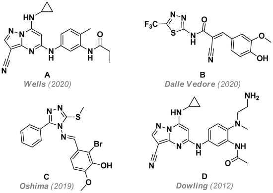 The antitumor activity of azolo[1,5-a]pyrimidines [22,23,24,25,26,27] has been related to the inhibition of cancer-associated kinases [28,29] (cyclin-dependent kinase 2 and phosphoinositide-3-kinase). However, recent Safari’s work demonstrates a positive trend in the cytotoxic effect of nitro-containing azolo[1,5-a]pyrimidines against human malignant melanoma cells (A375) and prostate cancer (PC3 cells, LNCaP cells) [30]. Examples of azolo[1,5-a]pyrimidines exhibiting antitumor activities are shown in Figure 2.